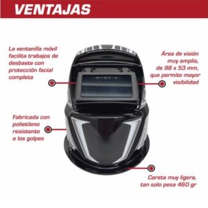 Careta para soldador de polietileno de alta densidad para utilizarse con los procesos SMAW, GMAW, GTAW y esmerilado, óptima para cualquier tipo de trabajo.